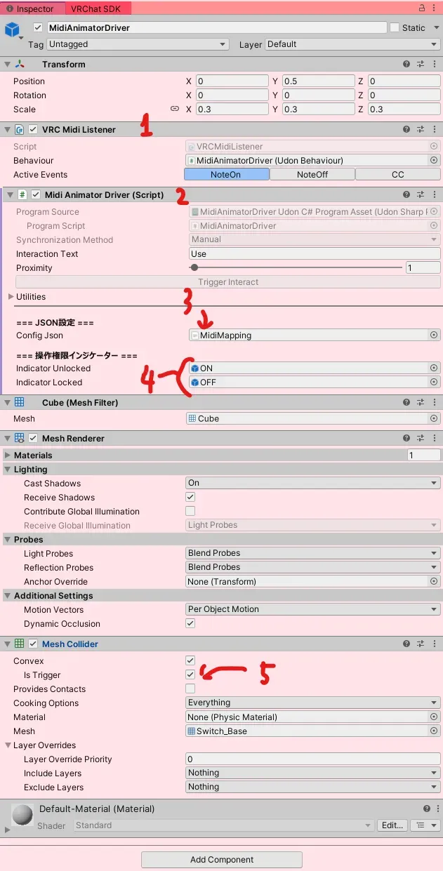- Add Component > VRC Midi Listener を追加します